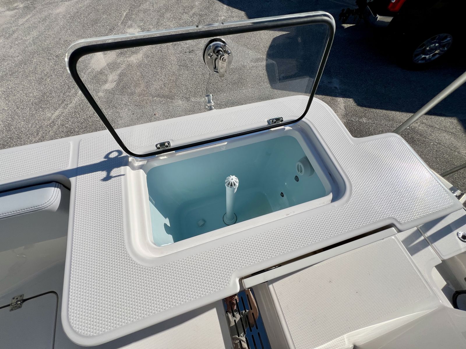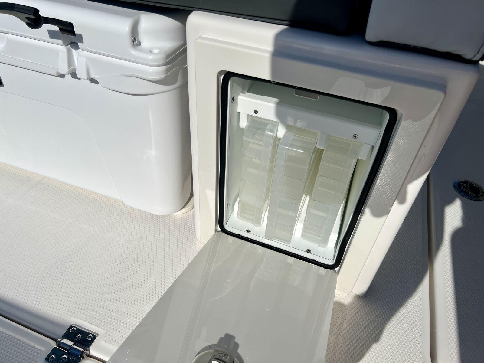 Aft Facing Bench Seat with Stainless Steel Drink Holders and Carry On 65 Qt Yeti Cooler
